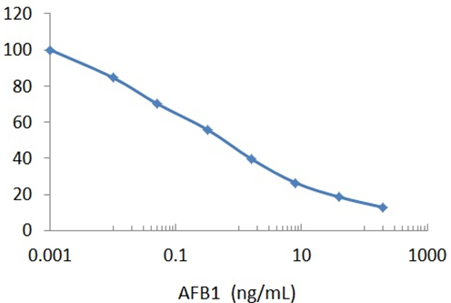 Direct competitive inhibition ELISA using immobilized AFB1-BSA (ICP1203, 0.1 ug/uL) and anti-AFB1 HRP (0.1 μg/μL), 50% inhibition occurred at 0.5 ng/mL of free AFB1 under a non-optimized condition.