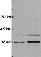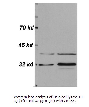 Western blot analysis of HeLa cell lysate 10 μg (left) and 30 μg (right) with CN0830.
