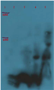 Western blot analysis of the di-methylated proteins from swine spleen cells lysate (lanes 4-5) and acid-extraction histones. (Lanes 2-3) with rabbit anti-di-methyl lysine antibodies (anti-MeK, ICP0701).