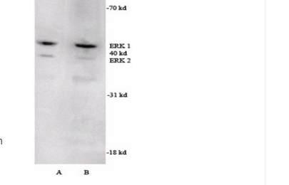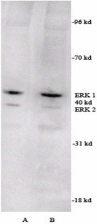 The antibody recognizes p44 ERK1 of human, rat, bovine, mouse and rabbit. There is a slight cross reaction with p42 ERK2.