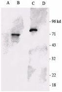 Western blot analysis of p70 S6K immunoprecipitated from mouse brain extract (B) and using S6K-HRP as a probe. Immunoprecipitation negative control (A).