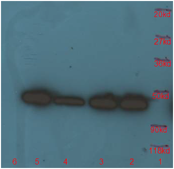 The DYKDDDDK-tag protein (50 kDa) expressed cell lysate and affinity enriched by IP with DYKDDDDK-tag antibody agarose ( ICP1315 ) followed by WB analysis with DYKDDDDK-tag antibody HRP conjugates (ICP0902)