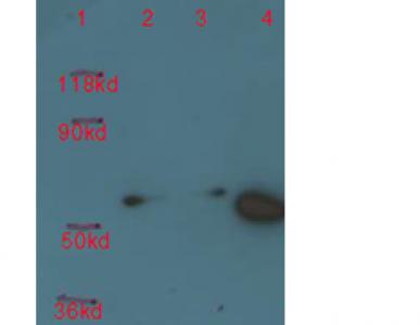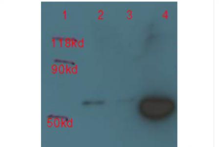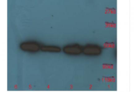 The His-tag protein (50 kDa) expressed cell lysate and affinity enriched by IP with His-tag antibody agarose (ICP1310) followed by WB analysis with His-tag antibody HRP conjugates (ICP0851)