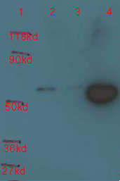 Western-blot analysis of the HA-tag protein (50 kd) expressed cell lysate and affinity enriched by IP, with HA-tag antibody, HRP conjugates (ICP0751) 1: Molecular marker 2: 10 uL of HA-tag protein in lysate (original cell lysate) 3: 10 uL of His-tag protein in lysate (after IP depletion) 4: 10 uL of the HA-tag protein in 100 uL of the eluting buffer enriched with 25 ug of the anti-His tag (ICP0750) from 2 mL of the original lysate.