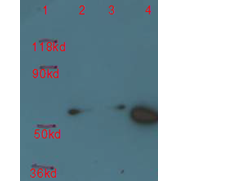 Western-blot with His-tag antibody, HRP (ICP0851) of the His-tag protein (50 kDa) expressed cell lysate and enriched His-tag protein by IP with anti-His-tag (ICP0850) 1: Molecular marker 2: 10 μL of His-tag protein in lysate (original cell lysate) 3: 10 μL of His-tag protein in lysate (after IP) 4: 10 μL of the His-tag protein in 100 μL of the IP eluting buffer, enriched with 25 μg of the anti-His tag (ICP0850) from 2 mL of the original lysate
