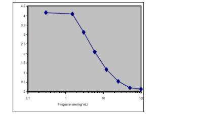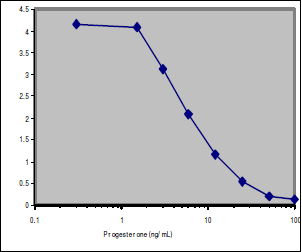 Direct competitive inhibition ELISA using immobilized anti-progesterone (3 μg/mL), and progesterone-labelled HRP (100 ng/mL). 50% inhibition occurred at 5 ng/mL of free progesterone under non-optimized conditions.