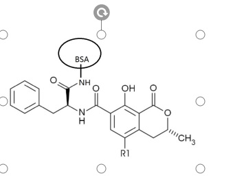 The Ochratoxin A (OA) is linked to Bovine serum albumin (BSA) via amine acylation. It can be used as an immunogen, or an antigen paired with the anti-OA Antibody (ICP9948) in both ELISA and gold colloid strip tests.